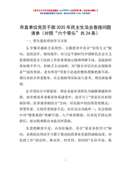 / 市直单位党员干部2025年民主生活会查摆问题清单(对照“六个带头”共24条)