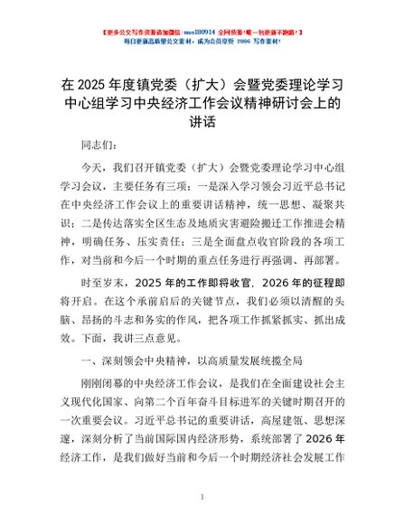 / 在2025年度镇党委(扩大)会暨党委理论学习中心组学习中央经济工作会议精神研讨会上的讲话