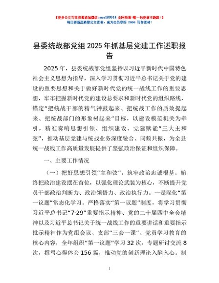 / 县委统战部党组2025年抓基层党建工作述职报告