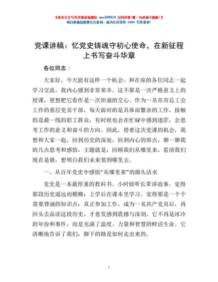 / 党课讲稿:忆党史铸魂守初心使命,在新征程上书写奋斗华章