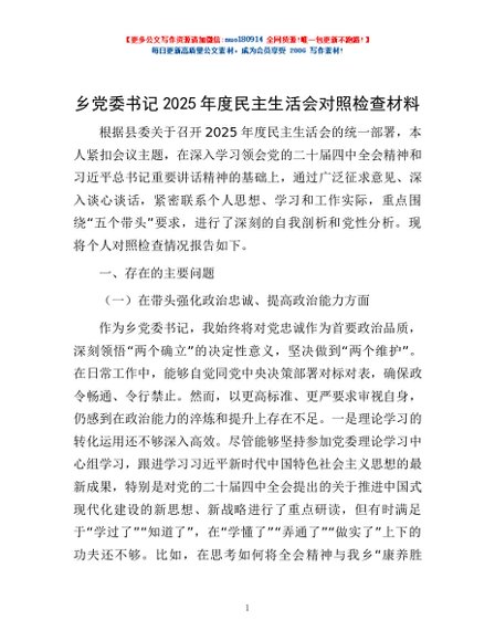 / 乡党委书记2025年度民主生活会对照检查材料