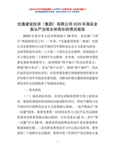 / 交通建设投资(集团)有限公司2025年落实全面从严治党主体责任的情况报告
