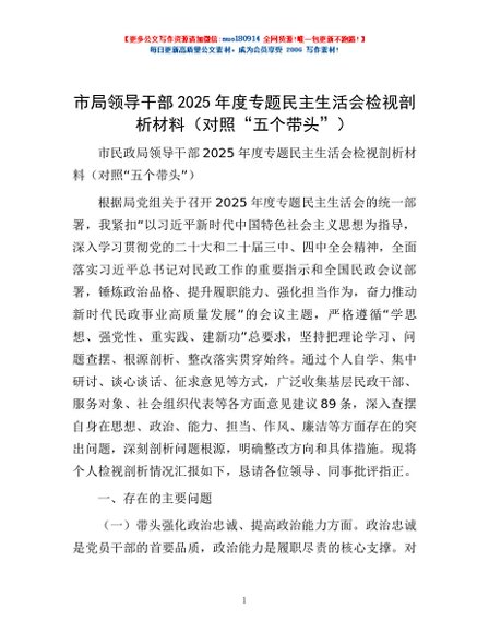 / 市局领导干部2025年度专题民主生活会检视剖析材料(对照“五个带头”)