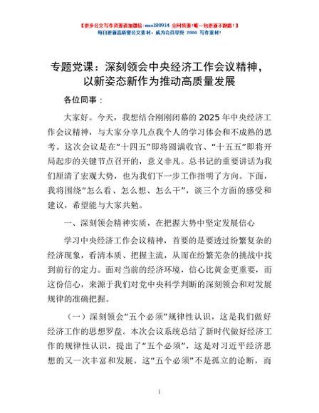 / 专题党课:深刻领会中央经济工作会议精神,以新姿态新作为推动高质量发展