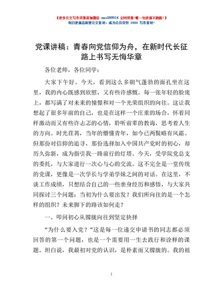 / 党课讲稿:青春向党信仰为舟,在新时代长征路上书写无悔华章