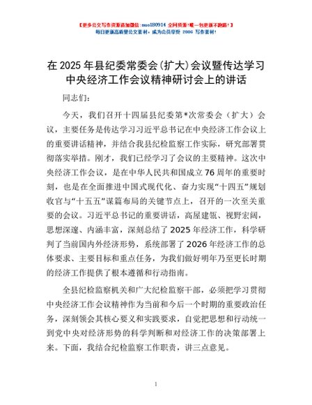 / 在2025年县纪委常委会(扩大)会议暨传达学习中央经济工作会议精神研讨会上的讲话
