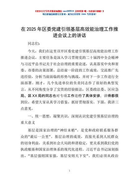 / 在2025年区委党建引领基层高效能治理工作推进会议上的讲话