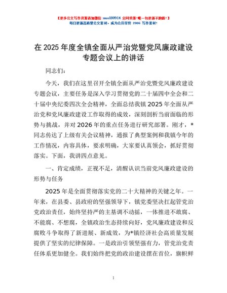 / 在2025年度全镇全面从严治党暨党风廉政建设专题会议上的讲话
