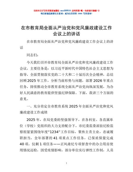 / 在市教育局全面从严治党和党风廉政建设工作会议上的讲话