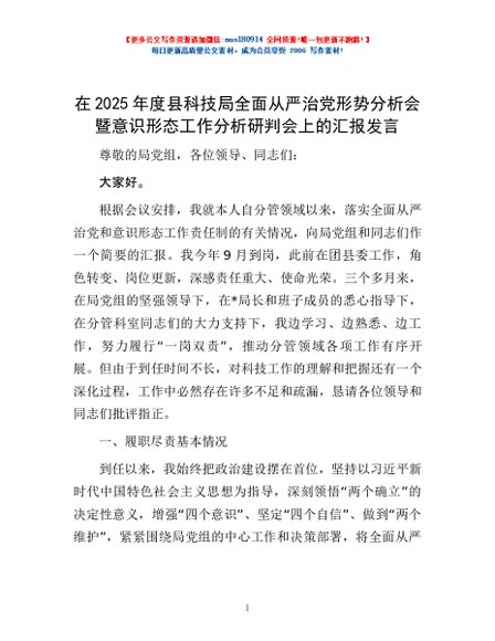 / 在2025年度县科技局全面从严治党形势分析会暨意识形态工作分析研判会上的汇报发言
