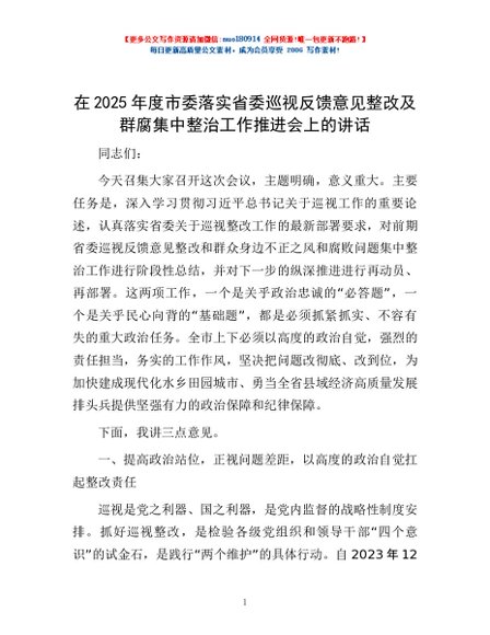 / 在2025年度市委落实省委巡视反馈意见整改及群腐集中整治工作推进会上的讲话