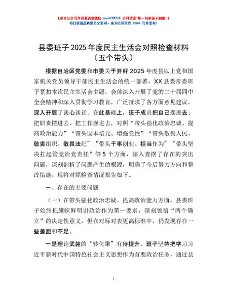 / 县委班子2025年度民主生活会对照检查材料(五个带头)