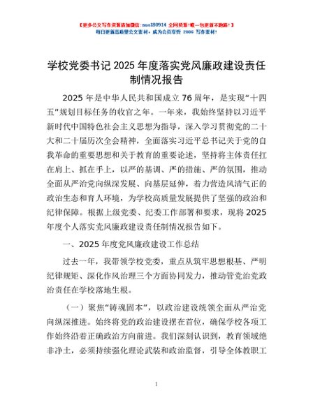 / 学校党委书记2025年度落实党风廉政建设责任制情况报告