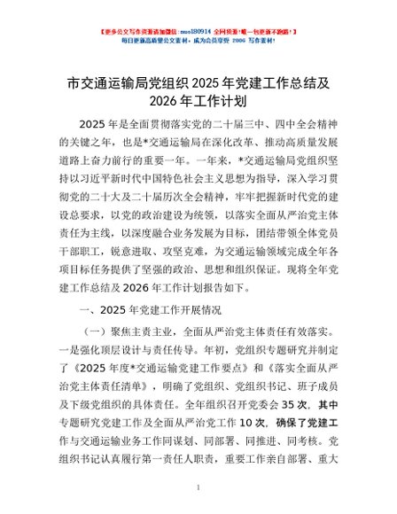 / 市交通运输局党组织2025年党建工作总结及2026年工作计划