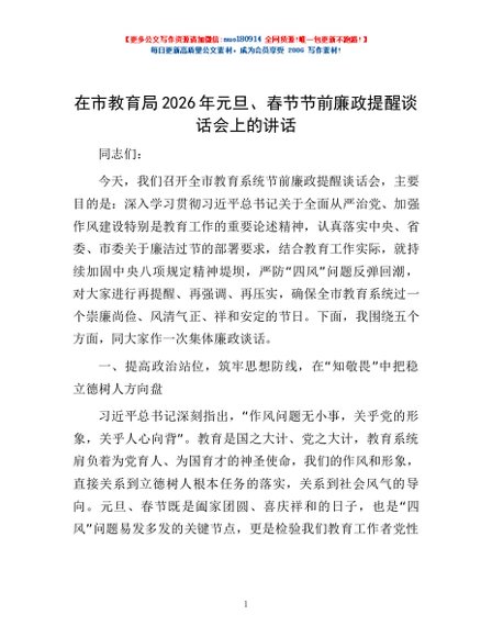 / 在市教育局2026年元旦、春节节前廉政提醒谈话会上的讲话