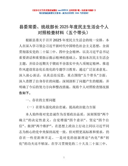 / 县委常委、统战部长2025年度民主生活会个人对照检查材料(五个带头)