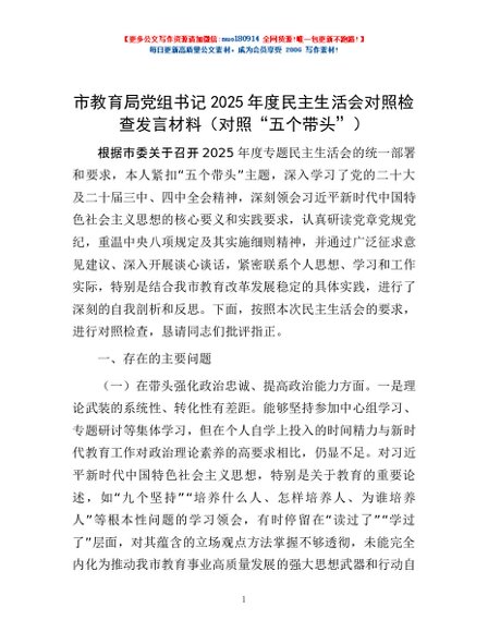 / 市教育局党组书记2025年度民主生活会对照检查发言材料(对照“五个带头”)