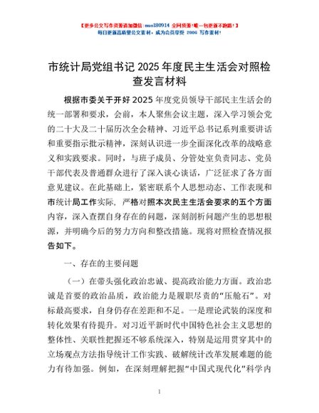 / 市统计局党组书记2025年度民主生活会对照检查发言材料
