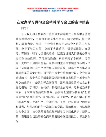 / 在党办学习贯彻全会精神学习会上的宣讲报告