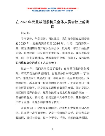 / 在2026年元旦放假前机关全体人员会议上的讲话