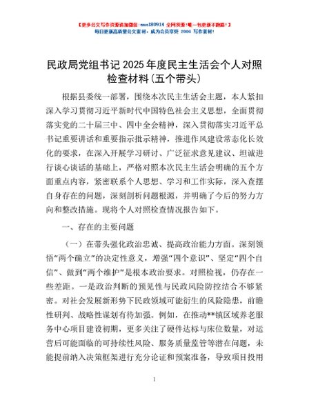 / 民政局党组书记2025年度民主生活会个人对照检查材料(五个带头)