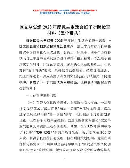 / 区文联党组2025年度民主生活会班子对照检查材料(五个带头)