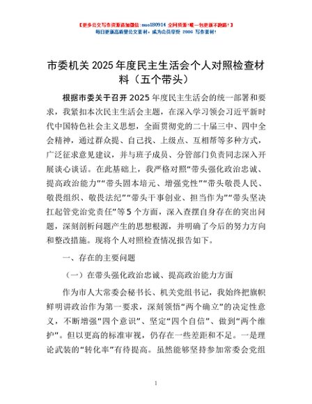 / 市委机关2025年度民主生活会个人对照检查材料(五个带头)
