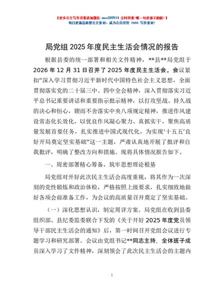 / 局党组2025年度民主生活会情况的报告