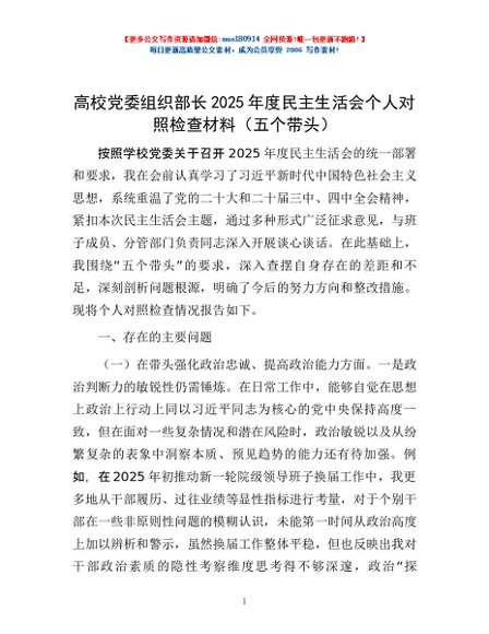 / 高校党委组织部长2025年度民主生活会个人对照检查材料(五个带头)