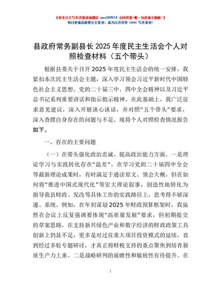 / 县政府常务副县长2025年度民主生活会个人对照检查材料(五个带头)