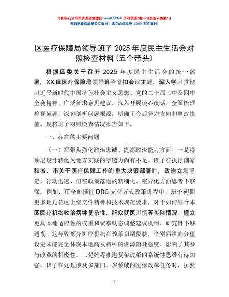 / 区医疗保障局领导班子2025年度民主生活会对照检查材料(五个带头)