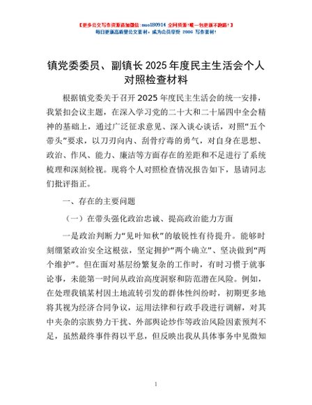 / 镇党委委员、副镇长2025年度民主生活会个人对照检查材料