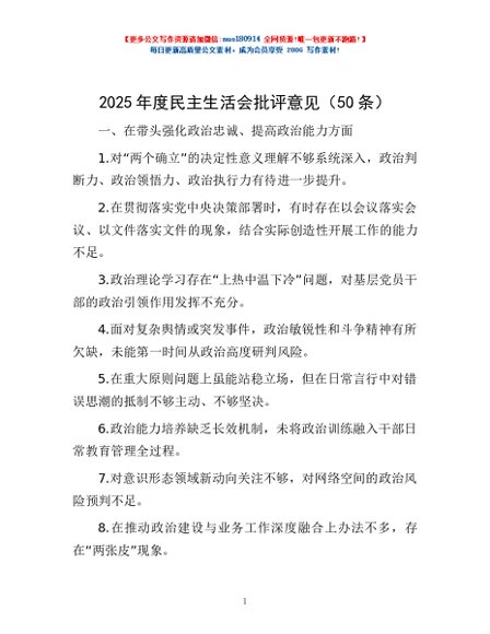 / 2025年度民主生活会批评意见(50条)
