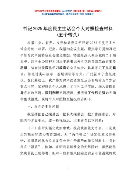 / 书记2025年度民主生活会个人对照检查材料(五个带头)