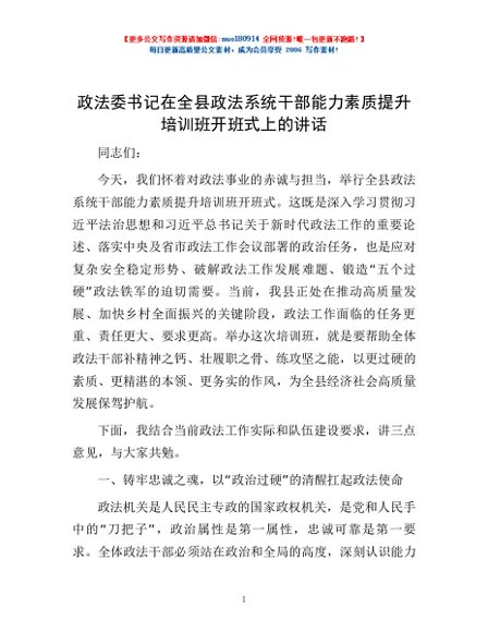 / 政法委书记在全县政法系统干部能力素质提升培训班开班式上的讲话