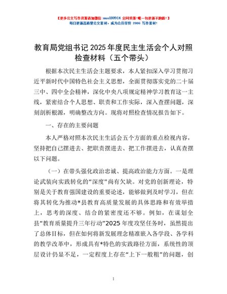 / 教育局党组书记2025年度民主生活会个人对照检查材料(五个带头)