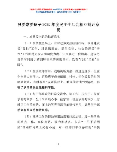 / 县委常委班子2025年度民主生活会相互批评意见