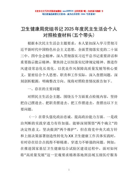 / 卫生健康局党组书记2025年度民主生活会个人对照检查材料(五个带头)