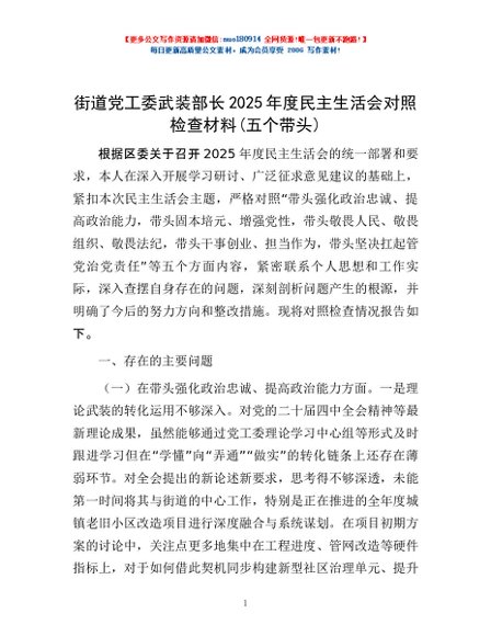 / 街道党工委武装部长2025年度民主生活会对照检查材料(五个带头)