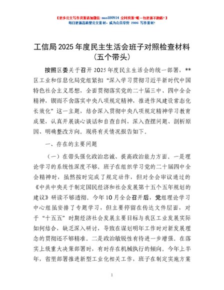 / 工信局2025年度民主生活会班子对照检查材料(五个带头)