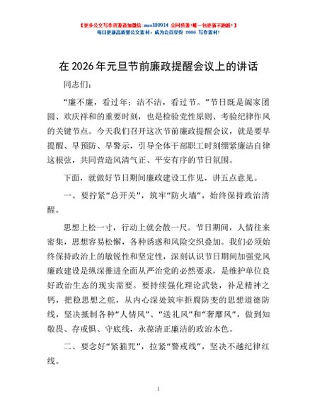 / 在2026年元旦节前廉政提醒会议上的讲话