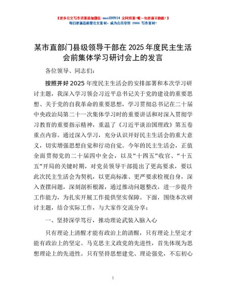 / 某市直部门县级领导干部在2025年度民主生活会前集体学习研讨会上的发言
