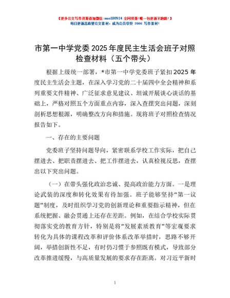 / 市第一中学党委2025年度民主生活会班子对照检查材料(五个带头)