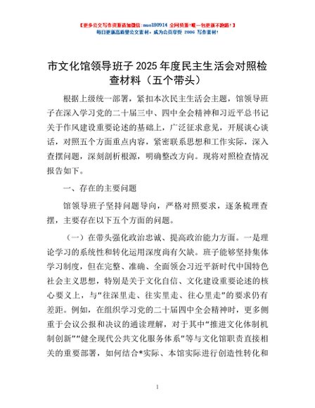 / 市文化馆领导班子2025年度民主生活会对照检查材料(五个带头)