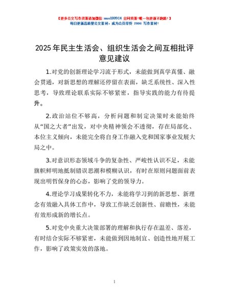 / 2025年民主生活会、组织生活会之间互相批评意见建议