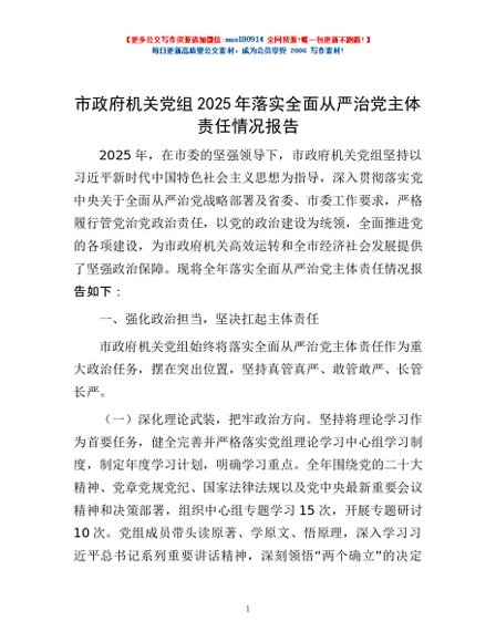 / 市政府机关党组2025年落实全面从严治党主体责任情况报告