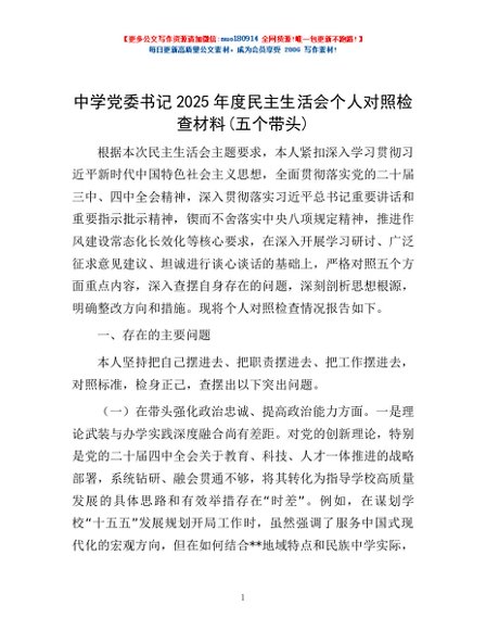 / 中学党委书记2025年度民主生活会个人对照检查材料(五个带头)