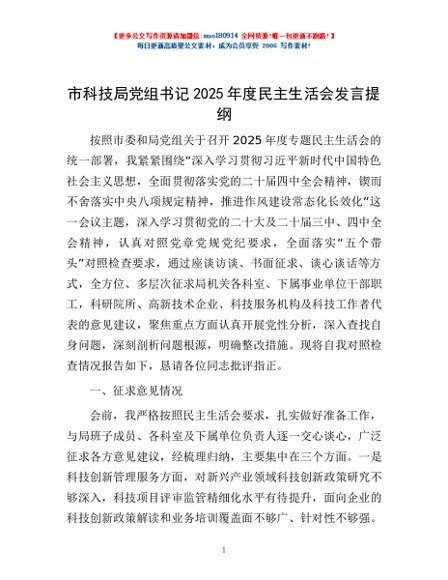 / 市科技局党组书记2025年度民主生活会发言提纲