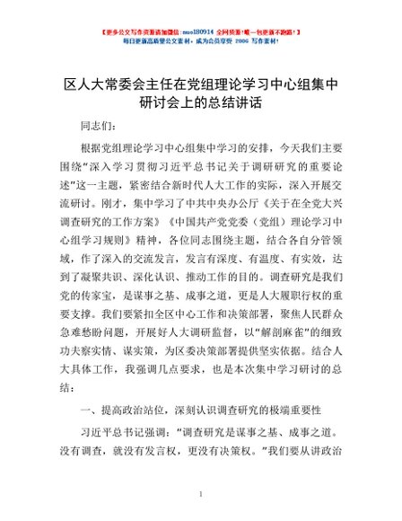 / 区人大常委会主任在党组理论学习中心组集中研讨会上的总结讲话