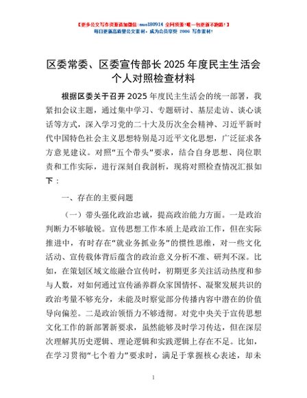 / 区委常委、区委宣传部长2025年度民主生活会个人对照检查材料